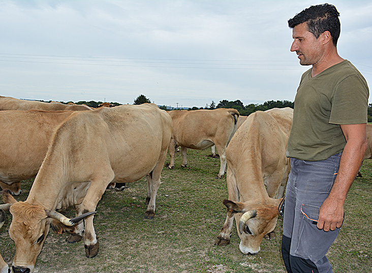 Les premières Aubrac – et premières vaches – sont arrivées en 2012 sur la ferme de la Mondote, à Labastide-du-Temple au cœur du Tarn-et-Garonne. Jérôme Loubières, 49 ans maintenant, a démarré son troupeau avec quatre génisses de 8 mois achetées à Jean-Claude Ramon de Laguiole après avoir visité, accompagné de son épouse Laurence, des élevages dans l’Aubrac. Faute de bâtiment d’élevage, il commence avec une étable en location. « Au début, on m’a traité de fou, il n’y a plus de vaches dans le secteur. » Une décision de se lancer dans l’élevage bovin viande qu’il explique par les caractéristiques de son exploitation et sa volonté de la valoriser au mieux. « Je n’ai pas une grosse exploitation, 52 hectares, et j’ai trois types de terrains différents. » Les alluvions lui permettent de cultiver kiwis et asperges, les terrains forts sont dédiés aux grandes cultures, quant aux boulbènes des terrasses, elles conviennent au raisin de table et aux prairies et pâtures pour l’élevage. Fin 2014, il a arraché les pommiers. Le choix de la race Aubrac est tout autant réfléchi : « Comme j’ai beaucoup de travail sur l’exploitation, je recherchais une vache facile, mixte, très maternelle, avec une facilité de vêlage, rustique. Et en plus c’est une belle vache. » Aujourd’hui, son troupeau est stabilisé à 30 mères et un taureau, Aubrac pur. Il garde des génisses pour le renouvellement. « A partir de maintenant, elles seront inscrites au Herd-Book de la race Aubrac. » précise-t-il, en motivant sa démarche : « toujours faire de mieux en mieux, peut-être qu’il y aura mes filles derrière… » Ses bêtes pâturent sur 15 ha autour de la stabulation et sont nourries à la farine de blé, féverole, pois, orge et au foin de l’exploitation, « à l’ancienne ». Les veaux sous la mère sont abattus avant 8 mois, les jeunes bovins le sont entre 8 et 12 mois, quelques vaches sont engraissées. Circuit court La viande est principalement vendue sous vide en libre service ou en colis au magasin « Le Fournial » situé au village, tout près de la ferme, que le couple a ouvert en 2018, tenu par Laurence avec l’aide d’une employée. Il en va de même pour les volailles et les porcs ainsi que les fruits et légumes de l’exploitation, le tout sous label Bienvenue à la Ferme. Jérôme et Laurence vont franchir une nouvelle étape : l’ouverture d’une boucherie traditionnelle avec embauche d’un boucher qui devrait se concrétiser d’ici la fin de l’année. « La viande d’Aubrac est persillée et goûteuse, les morceaux ne sont pas trop gros et on a le retour direct des clients : « c’est bien, continuez ! » »