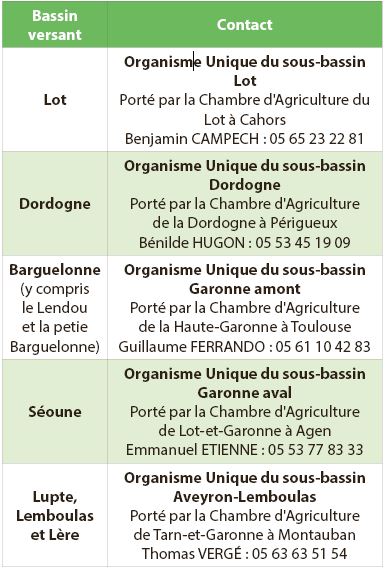 Les Organismes Uniques, chargés de la répartition des volumes d’eau pour l’irrigation agricole, adressent chaque année aux préleveurs irrigants un formulaire sur lequel figure le détail de leurs prélèvements d’eau (débit de la pompe, volume sollicité, surfaces susceptibles d’être irriguées pour la saison 2022, etc.). Le département du Lot est concerné par 5 Organismes Uniques : ceux du Lot, de la Dordogne, de la Garonne amont, de la Garonne aval et de l’Aveyron-Lemboulas. Selon les Organismes Uniques, les modalités de mise à jour des demandes peuvent varier. Dans tous les cas, veillez à respecter les dates limite indiquées sur vos formulaires de recensement. En effet, ces demandes d’autorisation de pompage doivent être transmises au préfet dans des délais imposés et restreints en vue d’être autorisées.