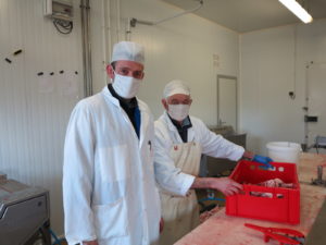 Créé en 2006, l’atelier de découpe des salaisons fermières regroupe quatre agriculteurs Lotois en conventionnel et en bio. Il transforme une centaine de tonnes par an, principalement 75 à 80 tonnes de porcs et 10 à 12 tonnes de bovin, ainsi que quelques chevreaux et canards. Eleveur de porcs à Espeyroux, Serge Couderc en est le co-gérant et précise « c’est une belle initiative prise par des producteurs, un pari réussi avec une activité aujourd’hui en rythme de croisière. Nous travaillons ensemble sur l’atelier et employons deux bouchers indépendants en prestation ainsi qu’une entreprise de nettoyage hebdomadaire. Nous avons mis en place une banque de travail pour bien décompter les heures de chacun et équilibrer en fin d’année. C’est très important pour la cohésion du groupe. Nous avons surtout la chance d’être à côté de l’abattoir où nous faisons tuer nos animaux dont nous récupérons directement les carcasses. Je considère que cet abattoir est un véritable outil départemental au service du territoire, d’intérêt collectif évident. Il doit absolument être pérennisé. Pour nous qui travaillons exclusivement en circuit court, l’abattoir et l’atelier de découpe sont deux maillons indispensables et indissociables. Nous avons d’ailleurs des relations permanentes avec le personnel pour discuter de la qualité d’abattage. Il se met bien à notre disposition et répond à nos attentes, un travail en partenariat qui est vraiment précieux…»