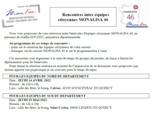 De prochaines rencontres sont proposées aux bénévoles MONALISA 46. Pour s’inscrire , merci de contacter l’association Ségala-Limarge au 05.65.38.98.17 ou par mail à l’adresse monalisa.lot@gmail.com