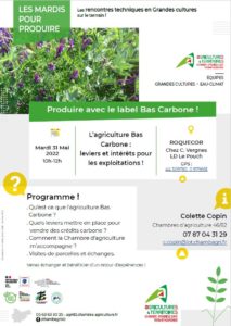 Venez à notre rencontre le Mardi 31 mai 2022 de 10h00 à 12h00 à Roquecor dans le cadre des Mardis pour Produire sur le thème de l’Agriculture Bas Carbone : leviers et intérêts pour les exploitations !
