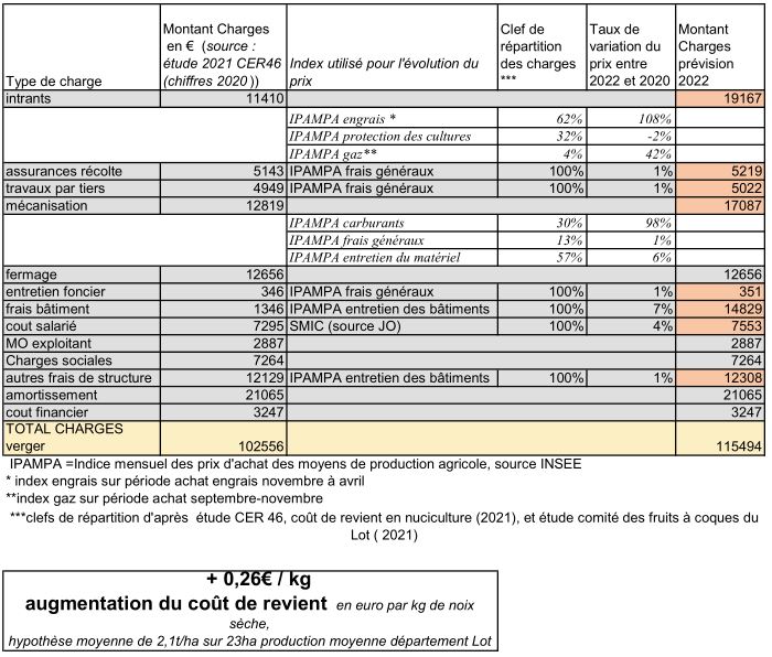 Cette année, les nuciculteurs lotois font face à une augmentation importante de certaines charges impactant la production. Les producteurs ont mené une réflexion sur l’impact de l’inflation sur leur coût de revient. Les principaux postes ayant une influence sur l’augmentation des prix sont le carburant et les engrais. Sur la même base de surface et de rendement moyen du département, l’augmentation du prix de revient prévisible serait de 26 centimes d’euros par Kilo de noix sèche. Cette hausse est certainement sous estimée compte tenu des nouvelles augmentations prévisibles du gaz, source principale d’énergie pour le séchage, dont les achats seront effectués au mois d’octobre 2022.