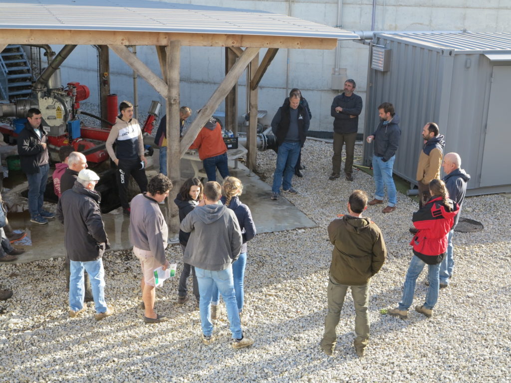 L’après midi était consacré à la visite du méthaniseur du Gaec des Bories. Lionel Fouché présentait la ferme familiale qui regroupe 4 associés et 3 salariés autour de 2650 brebis et 230 truies en système naisseur-engraisseur. La ferme est à 80 % en surfaces fourragères et s’interrogeait sur la valorisation de ses effluents d’élevage qui représentent des volumes importants. Les associés souhaitaient également sécuriser leur revenu et contribuer activement à la transition énergétique du territoire. Ils ont donc décidé de créer une structure nouvelle, la société « Fouchénergie » pour investir dans ce méthaniseur.