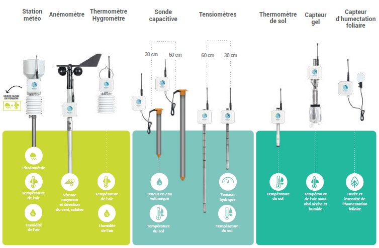 En plus de la station météorologique, vous avez aussi la possibilité d’acquérir un kit de sondes tensiométriques. Composé de six sondes, ce kit permet de mesurer la force que la racine doit déployer pour extraire l’eau du sol. La connaissance de ce paramètre clé du pilotage de l’irrigation apporte des éléments de réponses aux irrigants pour prendre la décision de démarrer l’irrigation, de reprendre après une pluie, ou encore de lancer le dernier tour d’eau de la campagne.
