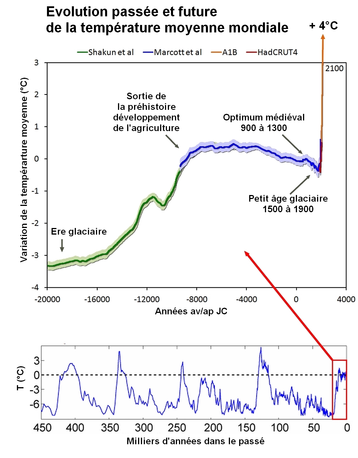 Pourquoi le climat changeait périodiquement dans le passé ? Au cours de l’ère Quaternaire, la Terre a vécu des variations régulières de sa température moyenne, périodes glaciaires (température moyenne de 10°C) et interglaciaires (température moyenne de15°C), se répétant sur des périodes d’environ 120 000 ans (100 000 ans de baisse suivis de 10 000 à 20 000 ans de hausse).