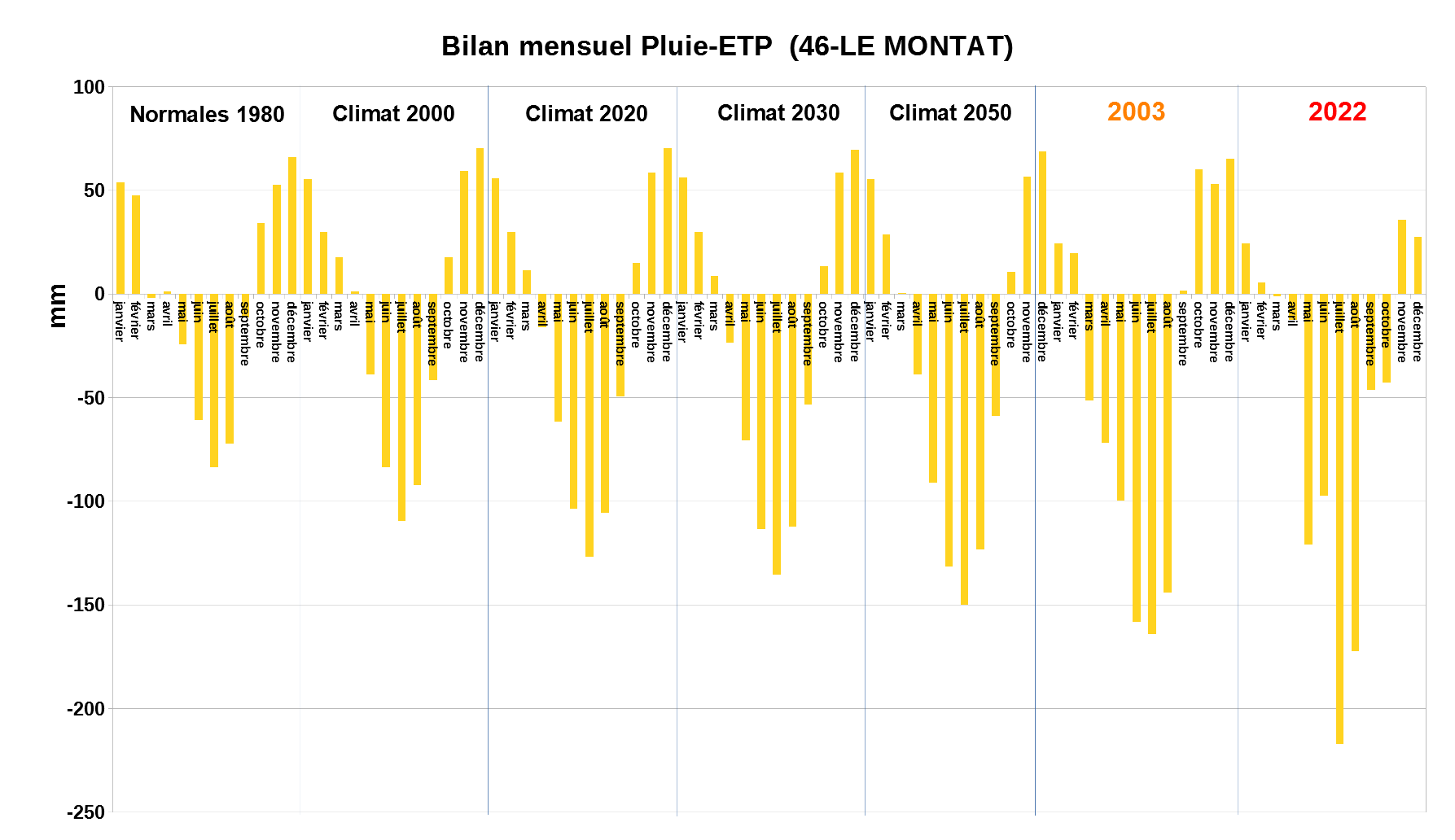 Bilans Pluie-ETP LE MONTAT climats types AP3C vs 2003 et 2022
