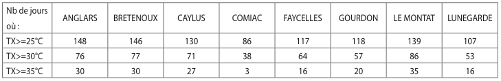 Comparée aux normales météo de la fin du 20ème siècle, l’année 2022 présente un déficit de pluviométrie moyen de 250 mm à 350 mm et une température moyenne annuelle supérieure de +2°C à +2,5°C selon les stations météo. Tous les mois de 2022 ont été plus chauds et le nombre de jours très chauds (plus de 30 et 35°C à l’ombre) est presque le double. D’un point de vue hydrique, les fortes températures ont provoqué des Évapotranspirations potentielles (ETP) très élevées et un bilan hydrique Pluie-ETP plus déficitaire qu’en 2003 et plus déficitaire encore que les projections climatiques dont nous disposons aujourd’hui pour 2050 dans le Lot (projections produites en 2015 avec une hypothèse de non-accélération du changement climatique). Sur Le Montat, le bilan hydrique potentiel n’a été positif que 4 mois en 2022 quand il était positif 6 à 7 mois de l’année à la fin du 20ème siècle, la température a dépassé les 30°C à l’ombre 86 jours, c’est un jour sur quatre !