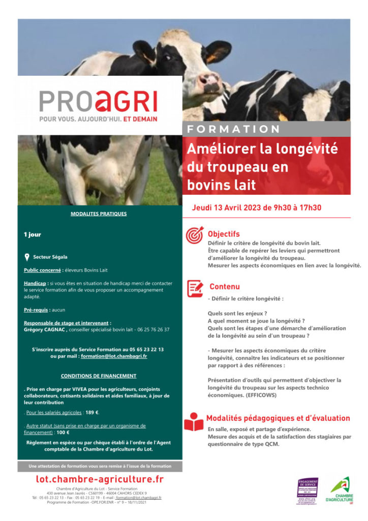 Formation : « Améliorer la longévité des troupeaux en bovins lait » le 13 avril, secteur Ségala.
