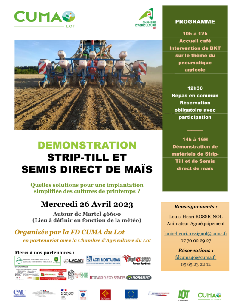 Louis-Henri ROSSIGNOL, animateur Agroéquipement, sera également présent pour répondre aux questions des participants. Les réservations peuvent se faire auprès de la FDCUMA du Lot, par téléphone ou par mail.
