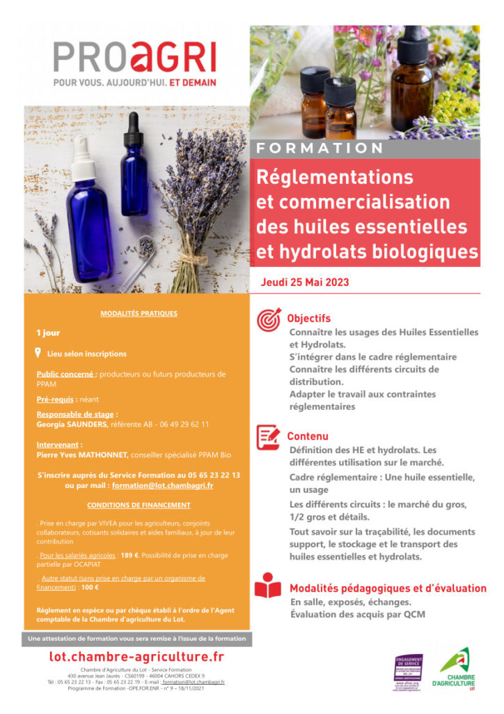 Formation jeudi 25 mai : Réglementations et commercialisation des huiles essentielles et hydrolats biologiques