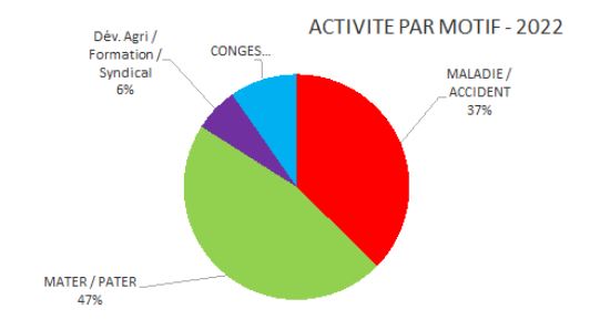Avec 40 127 h d’activité quasi stable (- 1 %), le Président a mis l’accent sur le rôle social du Service depuis 50 ans auprès de ses adhérents et rappelle que 83 % de l’activité s’est fait en élevage. Les remplacements MALADIE et ACCIDENT, motifs prioritaires, sont en diminution de 21 % (surtout en maladie – 3 175 h). En effet, l’intervention d’un salarié (appelé Agent de Remplacement) du Service de Remplacement permet la continuité de l’exploitation. Plus de 37 % de l’activité est fait pour ces 2 motifs. Comme les salariés, les agricultrices et agriculteurs, ont droit au congés MATERNITE et PATERNITE dans les mêmes conditions de durée. Ces motifs sont largement utilisés. Les mamans sont plus sereines d’arrêter de travailler pendant 4 mois à 6 mois. Le remplacement est gratuit. Les papas peuvent être plus disponible à l’arrivée du bébé pendant 25j. Ce motif est en très nette augmentation avec + 3947 h (+23 % en maternité et + 38 % an paternité). Les agriculteurs(trices) aussi, partent en CONGES (vacances ou week-end) et font confiances à un salarié expérimenté pour s’occuper des animaux (nécessité d’être présent 7 j / 7). Ce motif est en recul de 10 % (- 451 h). L’évolution du métier, nécessite pour l’exploitant (e) de s’absenter de son exploitation pour se former, participer à des réunions professionnelles en lien avec le développement agricole. Les adhérents du Service n’hésite plus à s’absenter et faire appel au Service de Remplacement.