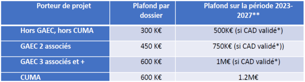 Plafond de 300 000 € à 1 000 000 € selon le cas (voir plus loin) Taux spécifique investissements Agroéquipements (ex M.413 réduction phyto et protection eau)