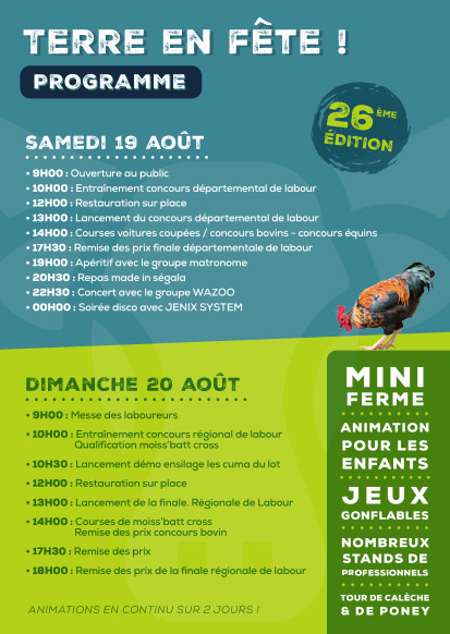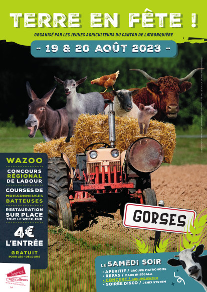 Les jeunes agriculteurs des cantons de Latronquière et Sousceyrac vous attendent nombreux pour cet exceptionnel week-end de fête autour de superbes animations agricoles et festives. Rendez vous sur la commune de Gorses qui accueille fièrement cette fête 2023.