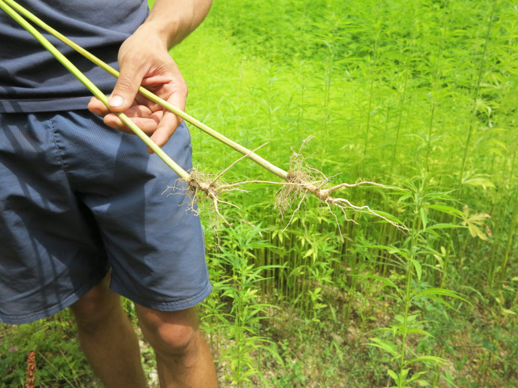 J’ai choisi une parcelle avec un sol profond et je la prépare avec un labour superficiel puis un hersage pour avoir une bonne finesse des mottes. J’apporte une fumure organique, 25tonnes/ha de fumier, car la plante aime l’azote et la matière organique. Puis je sème début avril au semoir à céréales à raison de 70 kg/ha. Je le roule pour bien tasser et je n’interviens plus jusqu’à la récolte en septembre. Il faut que le chanvre lève vite et bien puis il pousse tout seul jusqu’à atteindre 3 mètres de hauteur ! Attention à bien avoir une forte densité de tiges, ce qui garantit leur finesse et leur longueur.
