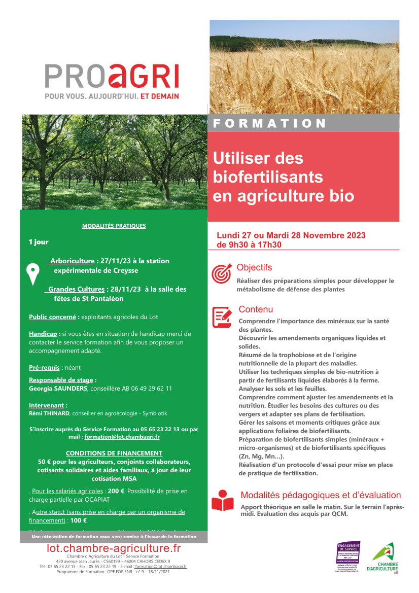 Actualité novembre 23, 2023 Aucun Commentaire 491 Formation Améliorer la disponibilité des nutriments avec les biofertilisants en Arboriculture le 27 Novembre à Creysse & Grandes cultures le 28 Novembre à Saint-Pantaléon Pour vous inscrire, cliquez sur le lien : Inscription ✍️ TEST SIGNATURE
