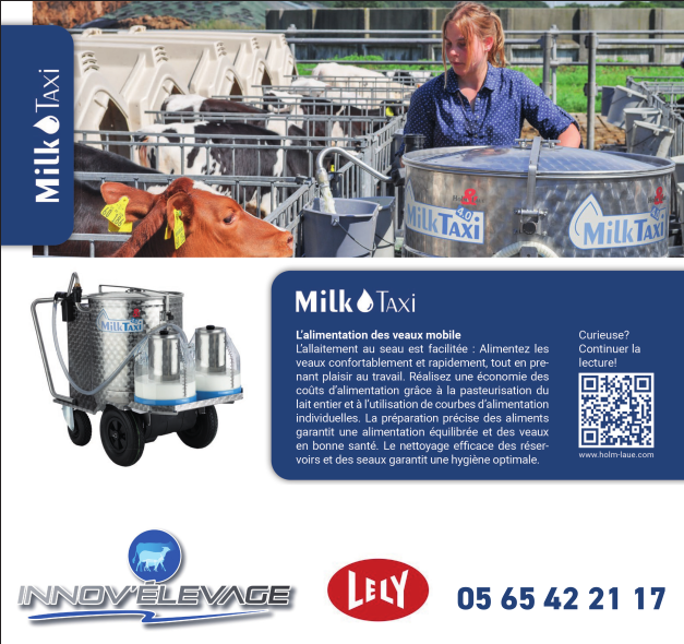« pour faciliter l’alimentation de nos veaux, nous avons acheté en 2017 un taxi-lait. C’est une cuve de 100 litres montée sur quatre roues et entièrement électrifiée. Le lait s’y prépare très facilement, le mélange poudre et eau se faisant automatiquement à la température que nous programmons. Pour avancer, on appuie sur la gâchette et cela marche tout seul grâce au moteur électrique. Cet équipement est doté de plusieurs moteurs électriques qui le rendent totalement autonome pour rouler et distribuer. Pour le fonctionnement et le rechargement des batteries, il suffit de le brancher sur une prise normale.