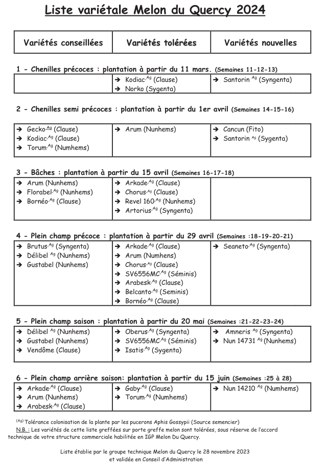 Le syndicat des producteurs de melons du Quercy conseille les variétés suivantes en fonction des résultats qualitatifs et sanitaires observés sur le terrain.