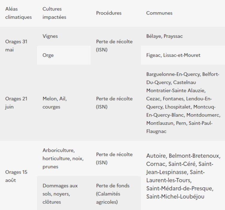 Le département du Lot, a été durement touché par des épisodes orageux d’intensités exceptionnelles durant les mois de mai à août 2023, affectant différentes cultures.