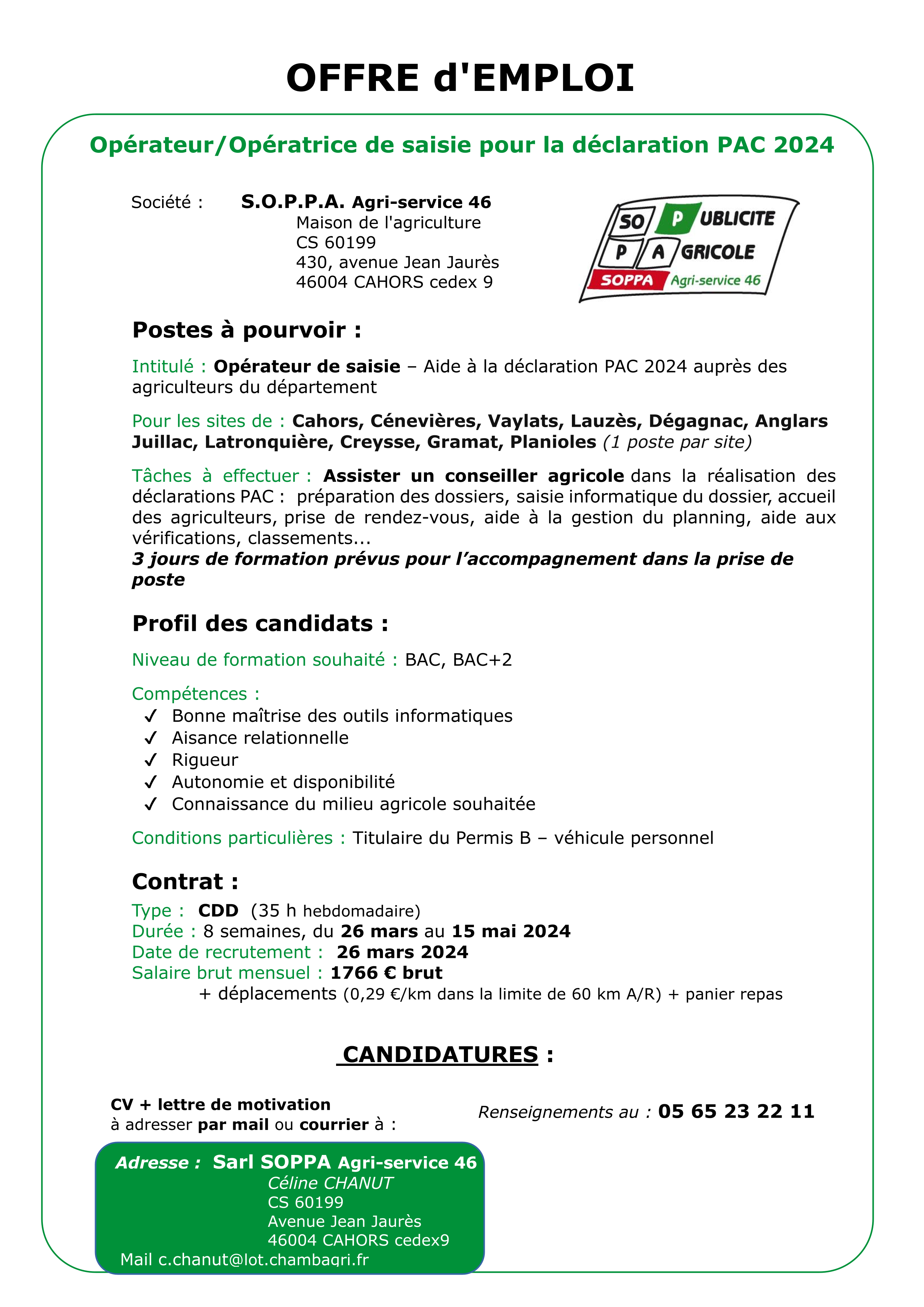 Actualité février 21, 2024 Aucun Commentaire 787 Offre emploi : Opérateur/Opératrice de saisie déclarations PAC 2024 ✍️ TEST SIGNATURE