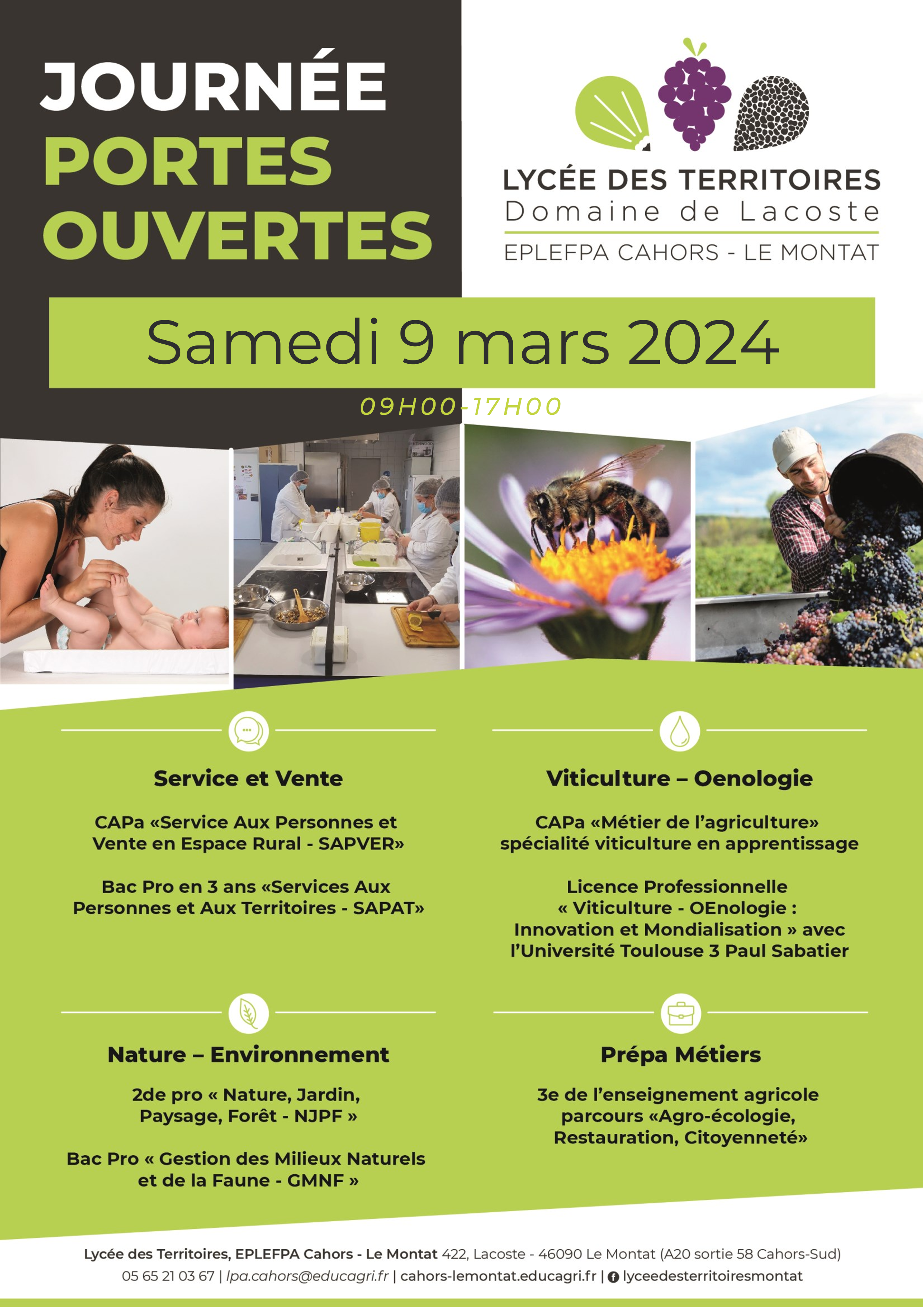 L’équipe pédagogique constituée d’enseignants du lycée et de professionnels du secteur de la viticulture est à pied d’œuvre pour préparer l’arrivée de notre première promotion d’apprentis en septembre 2024. Tout devrait être prêt, il ne reste plus qu’à candidater ! Si vous êtes intéressé par l’une ou l’autre de ces formations, n’hésitez pas à prendre contact avec le coordinateur pédagogique Guillaume DELEVALLEZ au 06 74 94 74 29 et à venir à notre rencontre le samedi 9 mars à l’occasion de notre Journée Portes Ouvertes. Le vignoble du Domaine de Lacoste sera le terrain de jeu idéal pour nos futurs apprentis CAPa viti