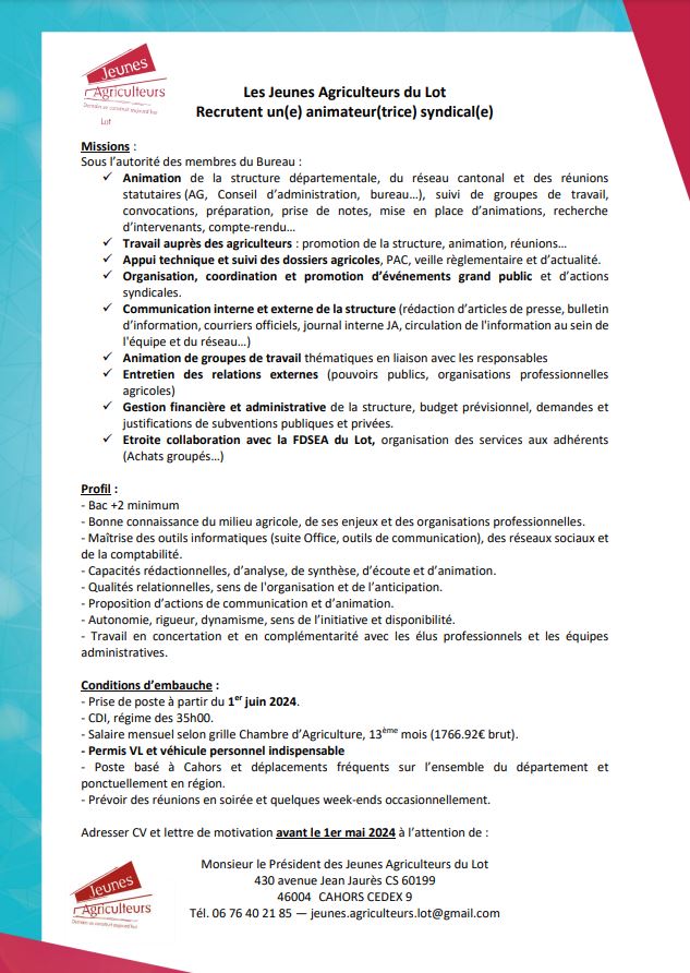 Les Jeunes Agriculteurs Recrutent un(e) animateur(trice) syndical(e)