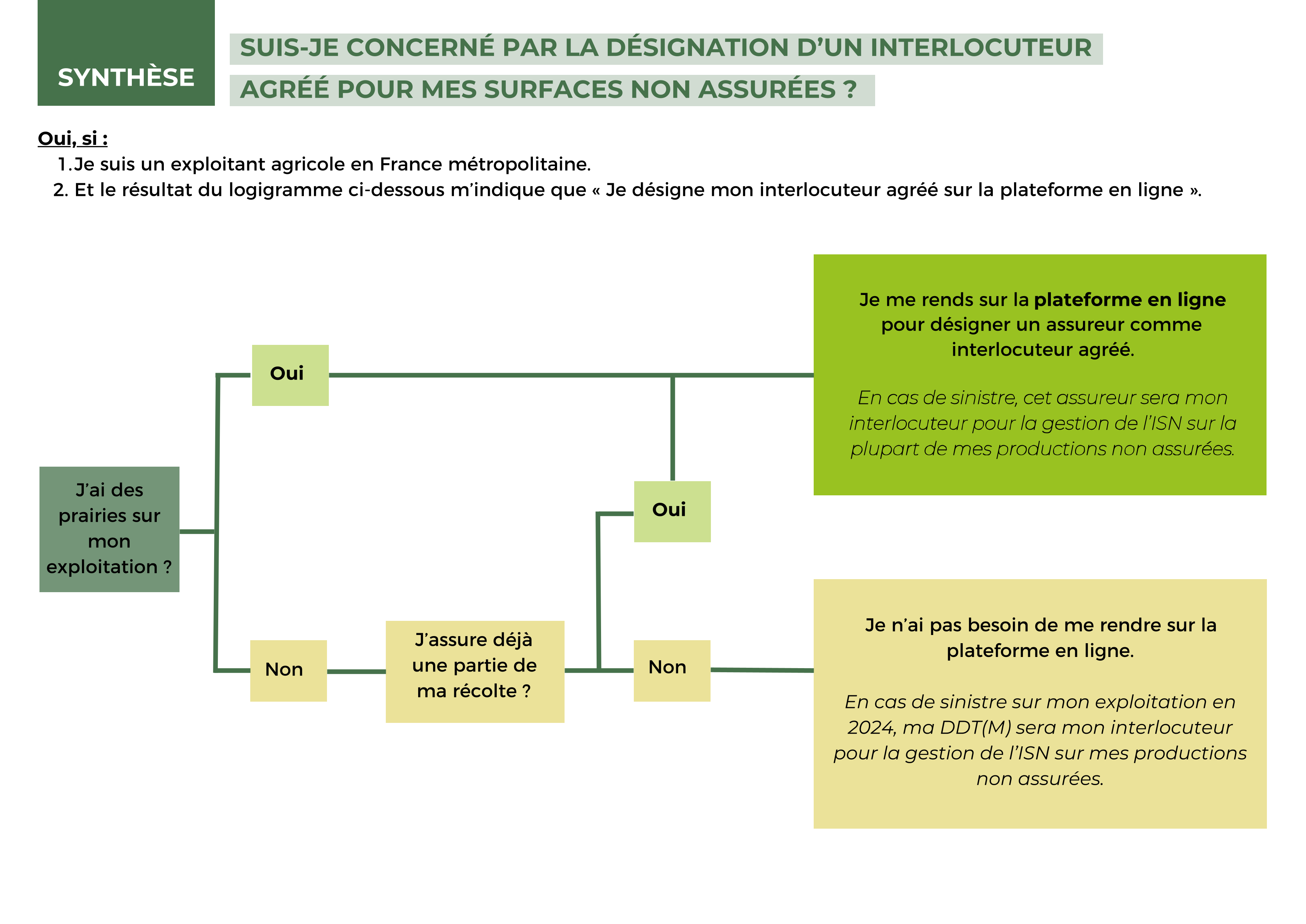 En 2024, vous devez choisir un interlocuteur agréé parmi les entreprises d’assurance commercialisant des contrats d’assurance récolte subventionnables. Ce réseau d’interlocuteurs agréés a pour mission de gérer et verser l’ISN des productions non assurées dans plusieurs situations à compter de la campagne 2024 :