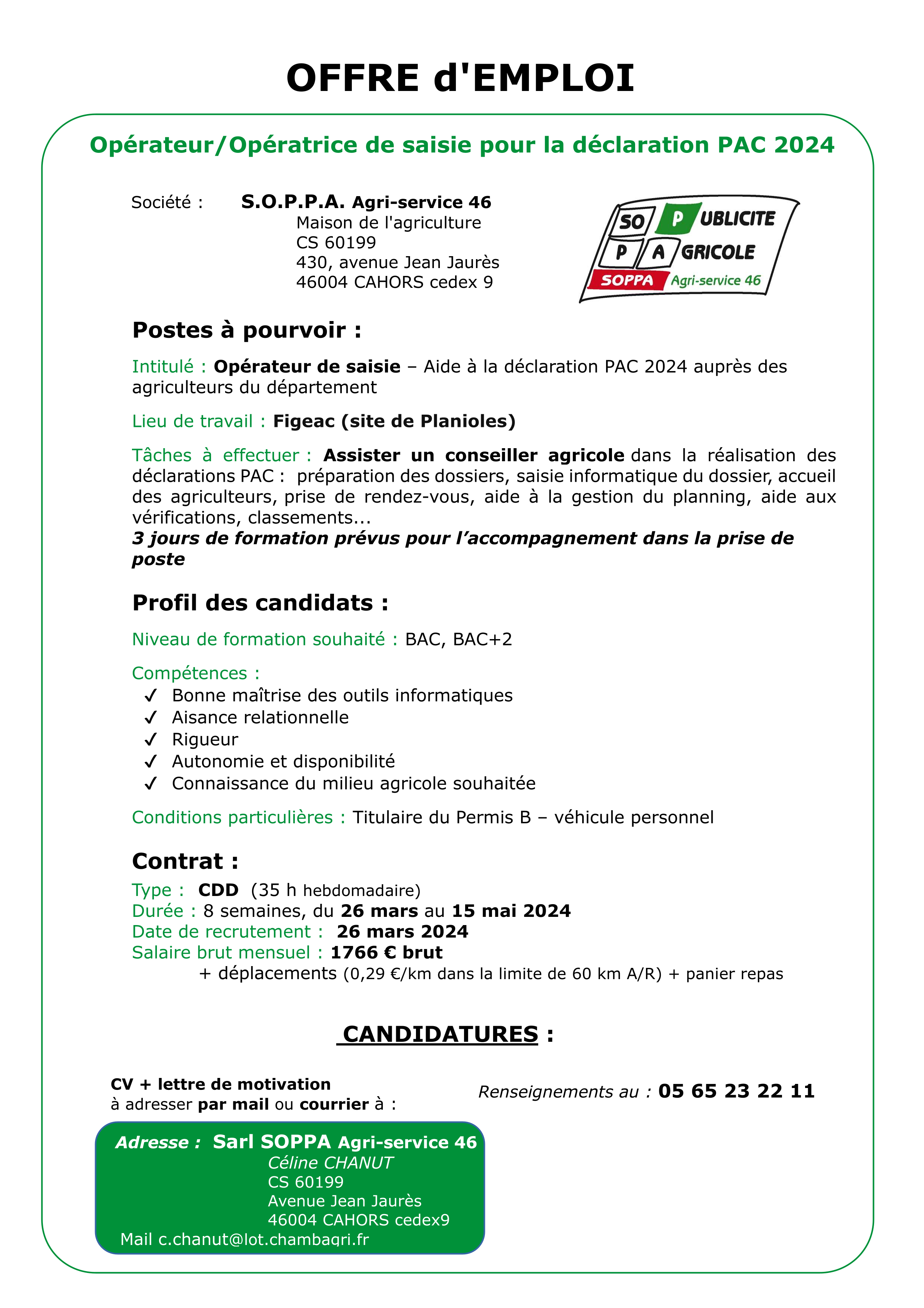 Offre d’emploi : Opérateur / Opératrice de saisie pour la déclaration PAC 2024