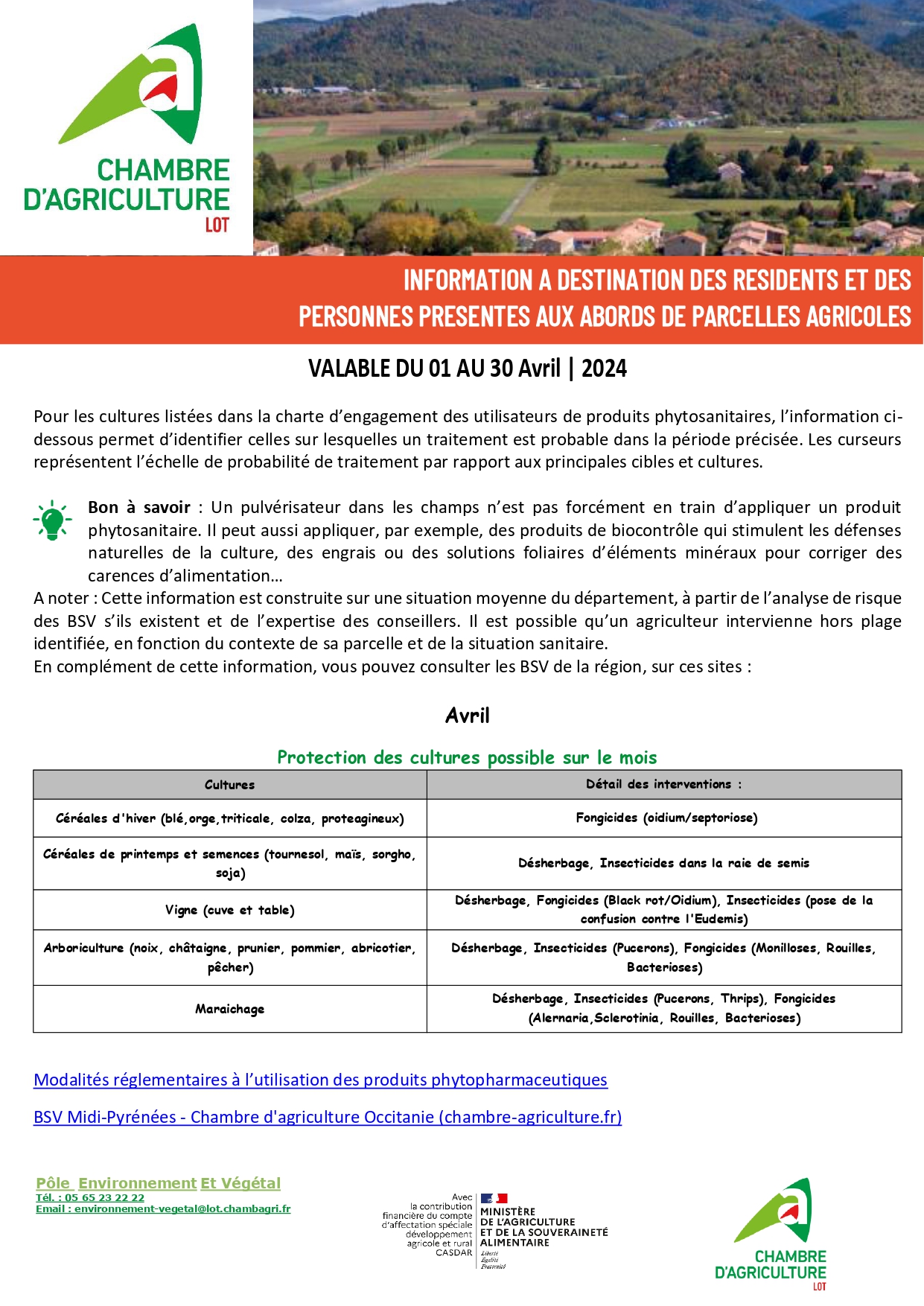 Environnement avril 2, 2024 Aucun Commentaire 435 Information à destination des résidents et des personnes présentes aux abords de parcelles agricoles Modalités réglementaires à l’utilisation des produits phytopharmaceutiques BSV Midi-Pyrénées – Chambre d’agriculture Occitanie (chambre-agriculture.fr) ✍️ TEST SIGNATURE