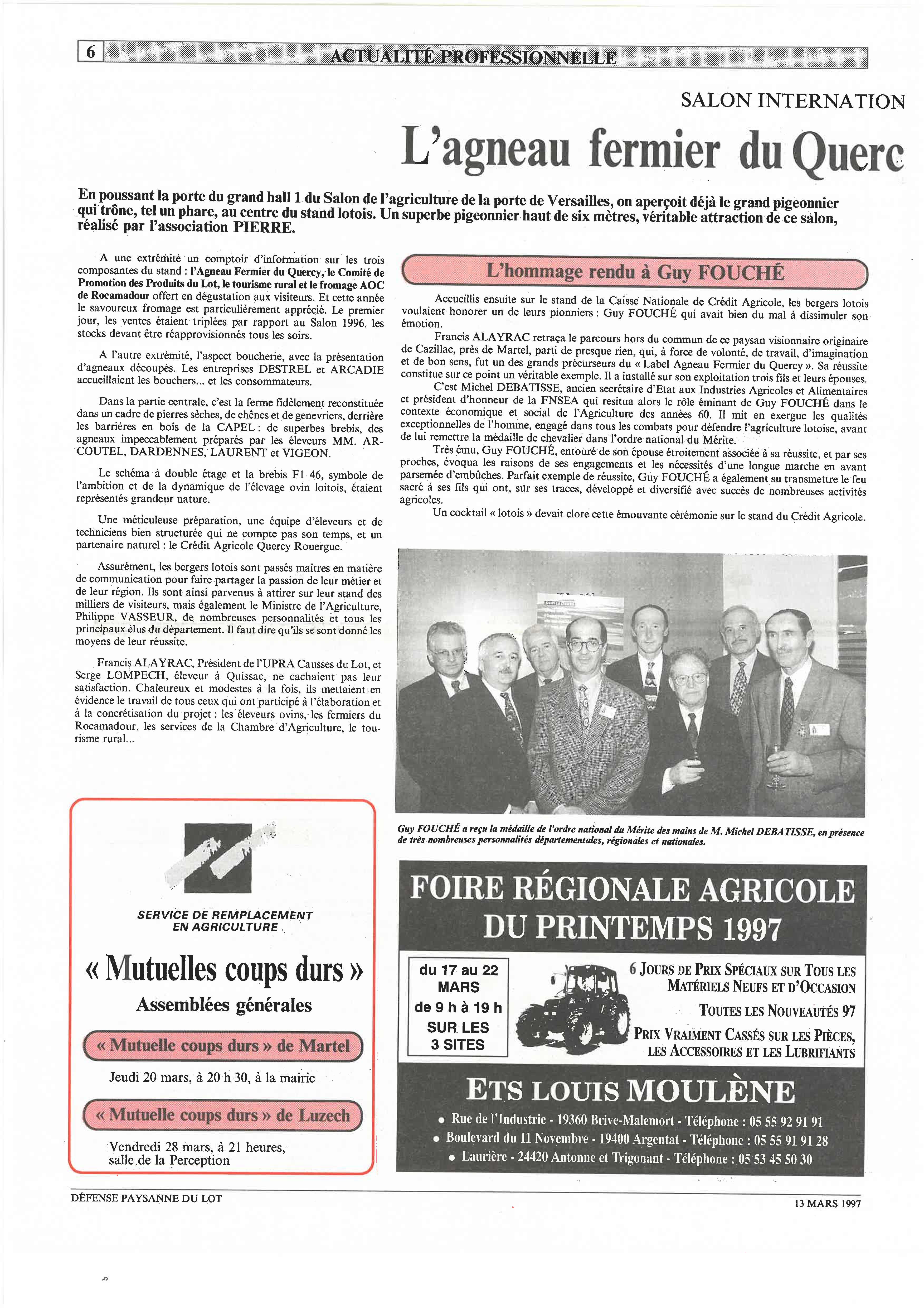 Guy Fouché fut investi dans de nombreuses responsabilités toujours axées sur la défense de la ruralité et du monde paysan. Il fut maire de sa commune, Cazillac, de 1971 à 1983. Il fut également l’un des plus jeunes élus membre de la Chambre d’agriculture, à 31 ans en 1964. Une institution où il siègera plus de trente ans, allant jusqu’à en devenir vice-président ordonnateur de 1989 à 1995. Sur le plan syndical, il milita à la Fdsea du lot, y représentant avec force et parfois virulence les éleveurs ovins. Il fut président du syndicat ovin de 1982 à 1991 et de tous les combats pour défendre sa filière de cœur. Convaincu de la nécessité d’impulser la promotion sociale des paysans par le progrès technique et l’organisation collective, il s’investit aussi dans le mouvement coopératif en participant à la création de la Capel en 1974. Il en devint administrateur puis président de 1992 à 1996. Pétrie des mêmes valeurs, son épouse Marthe fût également engagée de nombreuses années au bureau de la MSA du Lot. Ses enfants et petits-enfants poursuivent encore aujourd’hui le chemin de cet engagement. Guy Fouché a reçu plusieurs distinctions, il a été promu chevalier puis officier dans l’ordre national du mérite, médaille qui lui a été remise par Michel Debatisse au salon de l’agriculture 1997. Toute la profession agricole lui a rendu un dernier hommage et adressé ses sincères remerciements pour cette longue carrière au service des agriculteurs Lotois.