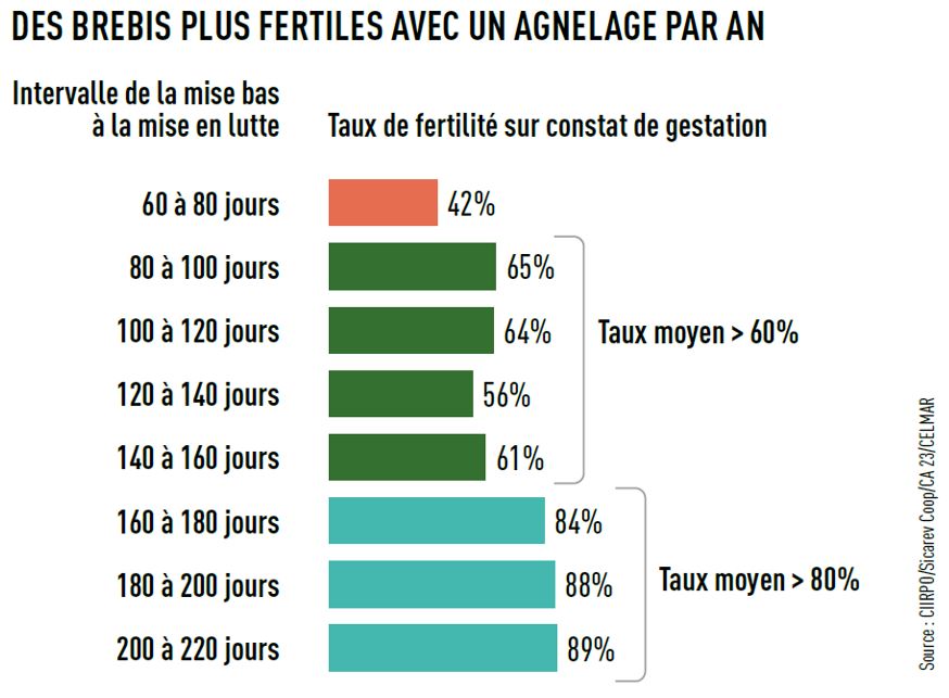 L’intervalle entre la dernière mise bas et la mise en lutte apparaît comme un critère prépondérant sur le taux de fertilité. Ainsi, il dépasse 80 % lorsque cette durée est supérieure à 160 jours contre environ 60 % entre 80 et 160 jours (graphe). En dessous de 80 jours, il est de l’ordre de 40 %. Enfin, ce sont les béliers qui déclenchent les ovulations des brebis au printemps. La réalisation de trois cycles de lutte, soit 51 jours, est ainsi préconisée.