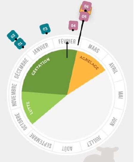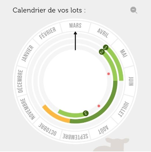 La création du lot d’animaux permet l’affichage d’un calendrier circulaire d’élevage et des différentes étapes et actions à mettre en place suivant les pratiques identifiées. L’ensemble est interactif et se met à jour suivant les actions réalisées et l’avancement des jours. Plusieurs lots peuvent fonctionner en simultanée et tous s’affichent sur le calendrier circulaire général, avec l’affichage des dates clés.
