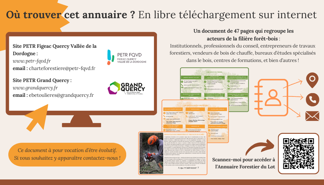 Les Chartes Forestières de Territoire du Grand Quercy et de Figeac Quercy Vallée de la Dordogne ont le plaisir de vous présenter l’Annuaire de la Filière forêt-bois du Lot. Depuis le 11 avril 2024, il vous est possible de retrouver l’ensemble des contacts des professionnels de la filière dans un même et unique document. Cet annuaire s’adresse à tous ceux qui s’intéressent de près ou de loin à la forêt, du propriétaires forestiers aux professionnels en passant par le grand public !