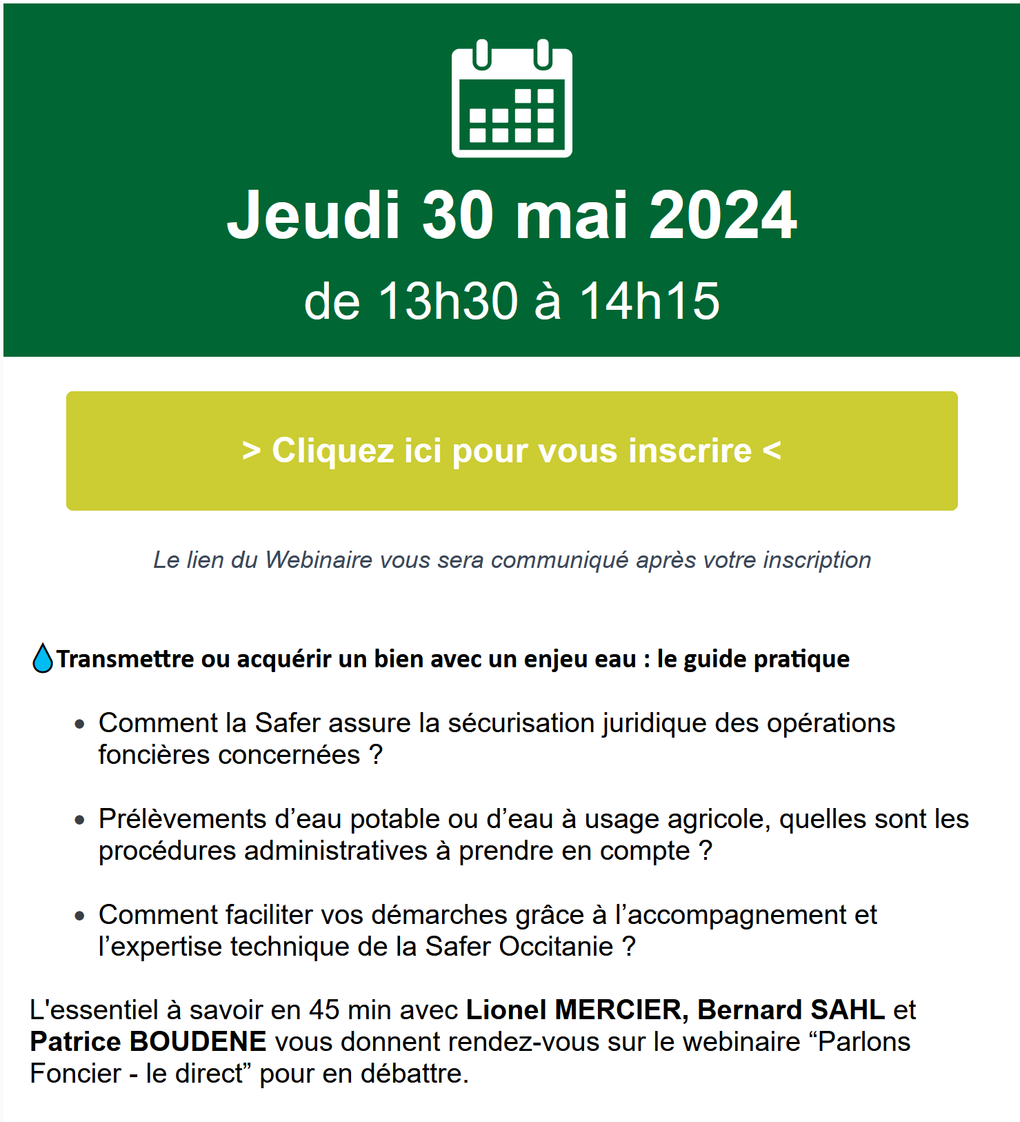 Actualité mai 23, 2024 Aucun Commentaire 453 SAFER : Parlons Foncier – Transmettre ou acquérir un bien avec un enjeu eau ✍️ TEST SIGNATURE