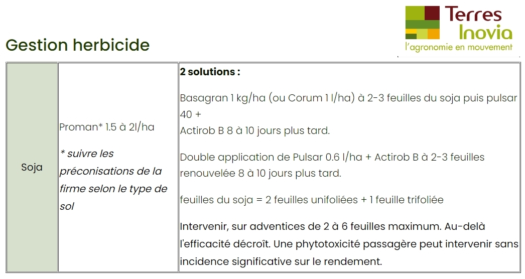 Le contrôle de l’ambroisie en cultures de soja représente une réelle difficulté en raison du faible nombre de substances actives à la fois efficaces et sélectives du soja. Dans les situations à forte infestation d’ambroisie (plus de 200 pieds/m2) la culture du soja est déconseillée !