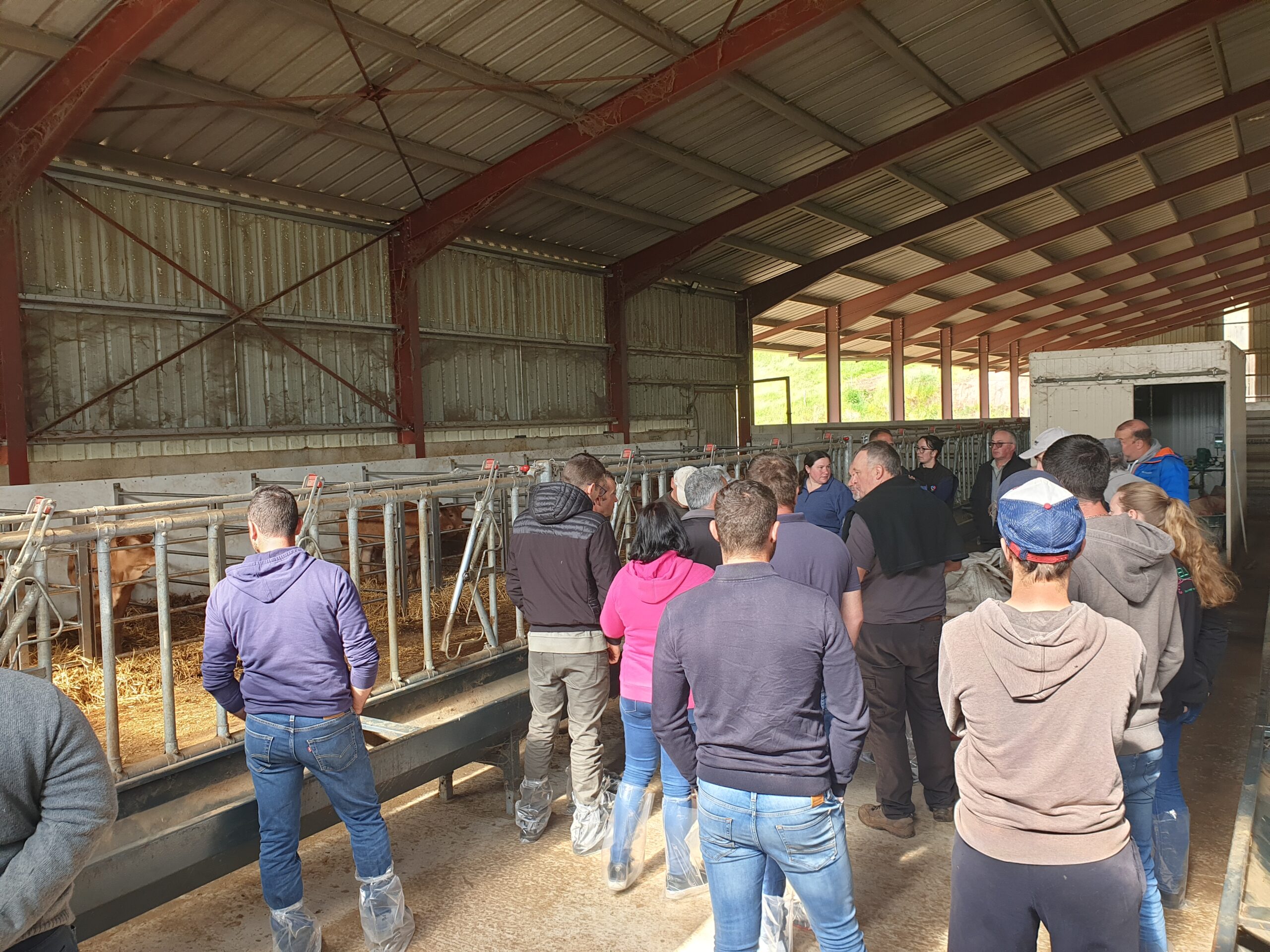 Le groupe s’est ensuite rendu sur l’exploitation de Pascal et Romain LACHAUD du GAEC DE PUY FALY, producteurs de veaux sous la mère mais aussi de pommes de terre sur la commune de St Bonnet la Rivière (19). Ils exploitent 80ha et ont un cheptel de 70 mères de race limousine. Ils ont présenté leur exploitation et répondu aux différentes questions des éleveurs. « Mon cheptel de 40 mères ainsi que l’étable entravée ne correspondaient plus à l’évolution de la ferme et à son devenir. C’est pour permettre l’installation de Romain que nous avons fait construire un bâtiment avec des panneaux photovoltaïques. » argumente Pascal. Pour l’aménagement de celui-ci, tout à été étudié pour prendre en compte la sécurité, la praticité, la maniabilité et la contention des animaux. Les participants ont posé de nombreuses questions sur le terrassement, le choix des matériaux pour la construction ainsi que sur les panneaux photovoltaïques. Ce bâtiment très lumineux dispose d’une partie stockage pour la paille et pour la partie animale d’une stabulation libre paillée pour les vaches et la salle de tétée classique est séparée en deux.  Des échanges ont eu lieu sur leur organisation biquotidienne, « on a chacun notre côté pour les veaux, comme ça on se challenge sur celui qui sort les meilleurs veaux ! » plaisante Pascal. Les éleveurs de la zone sud, ont notamment posé des questions sur la gestion de la tétée avec l’utilisation de l’aliment lacté. Cette pratique est peu utilisée sur leur secteur, où la complémentation des veaux se fait essentiellement par l’utilisation de tantes (vaches de race laitière). « Dans l’avenir, le prochain investissement à faire sera celui d’un bobcat pour nous faciliter le curage des box, lequel pour le moment se fait manuellement… » rajoute Romain.