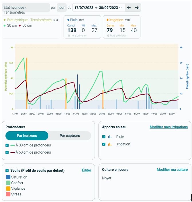 Le conseil agricole collectif et global de la chambre d’agriculture repose sur la diffusion à tous les irrigants du département d’informations sous forme de bulletins irrigation. Ce conseil, envoyé chaque semaine en période estivale, vise à apporter les éléments nécessaires au pilotage optimal de l’irrigation à partir d’un réseau de sonde tensiométrique. En collaboration avec l’UASA 46, ce réseau est composé de 34 stations météo connectées et d’environ 20 sondes tensiométriques, réparties sur les cultures les plus représentatives du territoire (noyer, asperge, maïs, soja, …). Installée au plus près des racines, les sondes tensiométriques mesure la tensiométrie (exprimée en kPa), c’est-à-dire la force que vont devoir exercer les racines pour extraire l’eau du sol. Plus la tensiométrie est haute, moins il y a d’eau disponible dans vos sols, et plus le risque de stress hydrique est élevé. Ces capteurs sont par conséquent très utiles pour piloter l’irrigation. Et faire des économies d’eau.