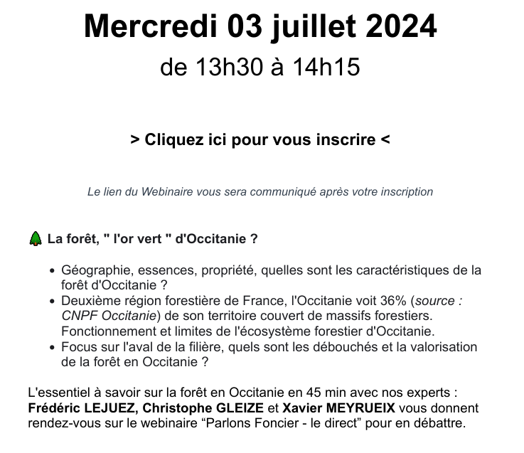 Actualité juin 20, 2024 Aucun Commentaire 570 SAFER : Parlons Foncier – La forêt, « l’or vert » d’Occitanie ? ✍️ TEST SIGNATURE