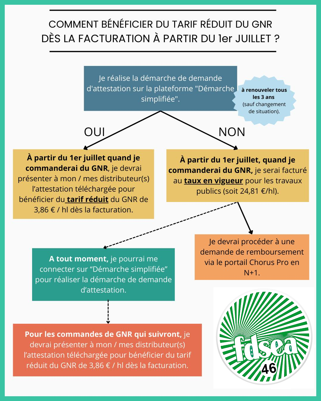 Suite au mouvement du début d’année, le Gouvernement avait annoncé la déduction du GNR directement à la pompe. Depuis le premier juillet, vous n’êtes plus obligé d’avancer votre TICPE lors de l’achat de GNR si vous présentez à votre fournisseur de carburant une « attestation d’identification au bénéfice du tarif réduit sur le gazole non-routier ».