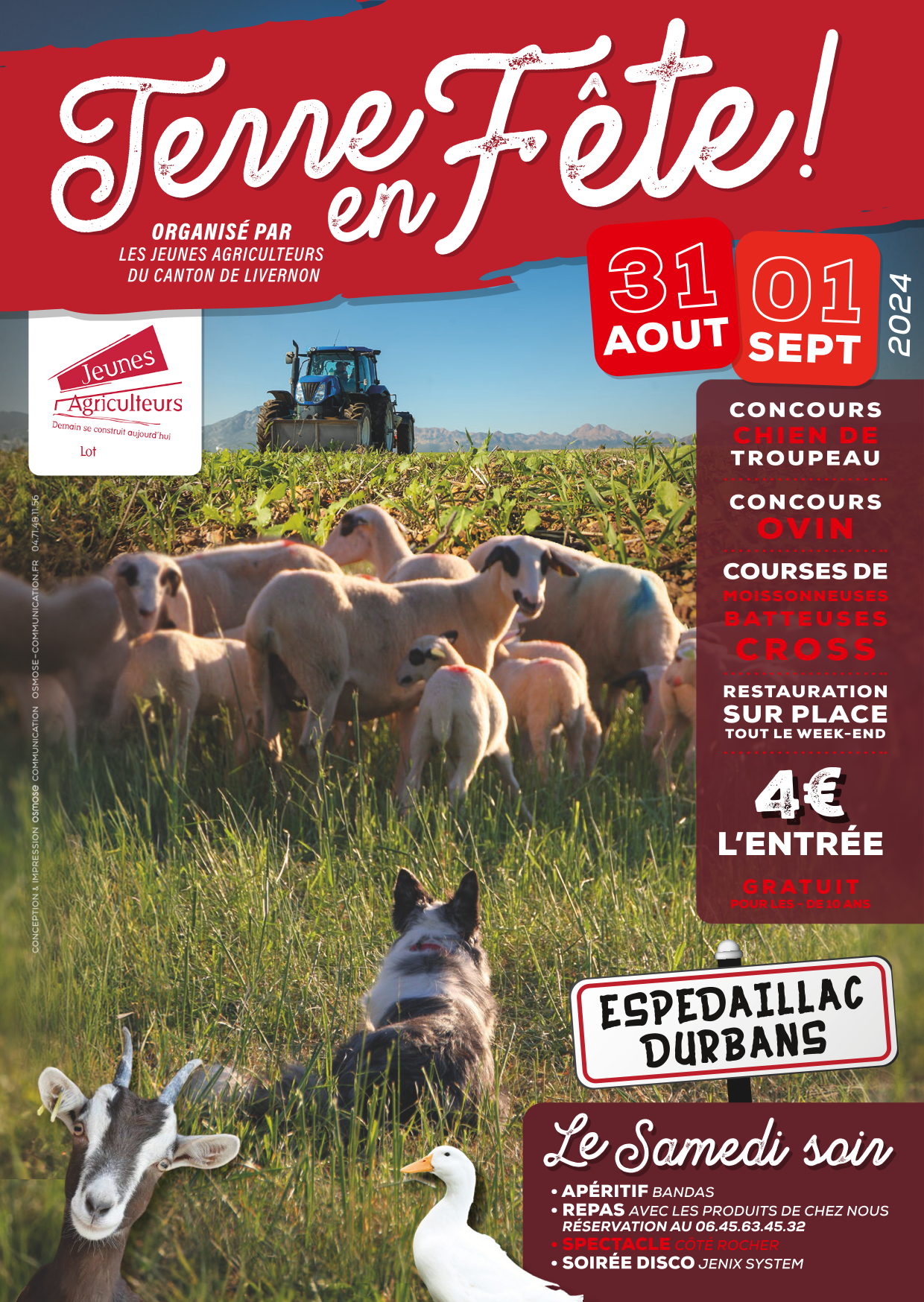 Les jeunes agriculteurs du canton de Livernon vous attendent nombreux pour cet exceptionnel week-end de fête autour de superbes animations agricoles et festives. Rendez vous sur les communes d’Espédaillac et Durbans qui accueillent fièrement cette fête 2024.