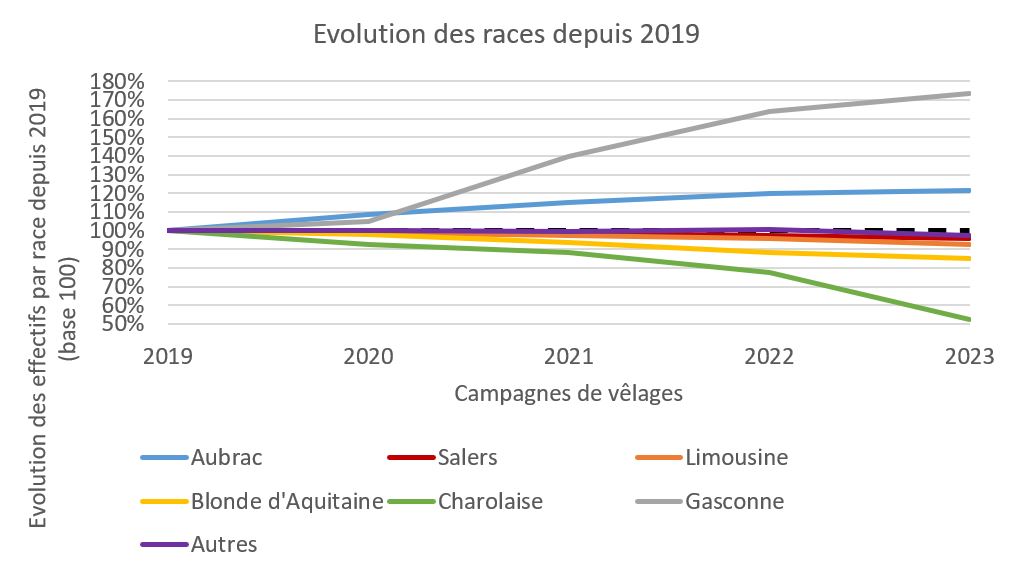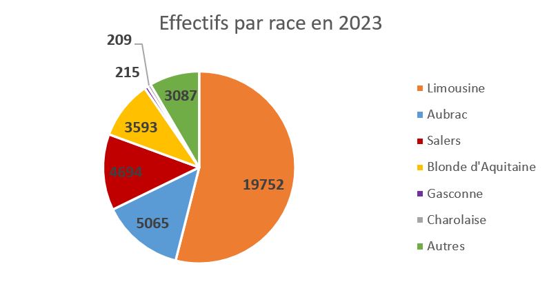 Au niveau de la répartition raciale départementale, c’est la race Limousine qui reste la plus représentée dans le Lot avec 19 752 vaches recensées en 2023 soit 54 % des effectifs lotois. Bien que cette répartition tende à diminuer avec une représentativité de la race de l’ordre de 56 % de la race sur les effectifs départementaux en 2019. Cette diminution se fait progressivement au profit de races dites « rustiques » comme l’Aubrac, et dans une moindre mesure, la Gasconne et la Salers.