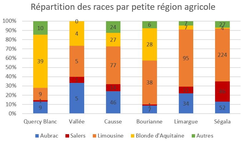 En regardant la race principale détenue par secteur, la proximité des berceaux de race influe fortement dans leur représentativité. En effet, la Blonde d’Aquitaine est surtout élevée dans le sud du Lot où elle est toujours la race la plus utilisée dans le Quercy Blanc. La Limousine est, quant à elle, la race majoritaire sur l’ensemble des petites régions agricoles. Côté Ségala, près de 20 % des cheptels sont de race Salers et plus généralement, les races « rustiques » Aubrac et Salers sont élevées par près de 35 % des détenteurs de bovins allaitants. A noter que la race Aubrac est de plus en plus représentée dans le Causse.