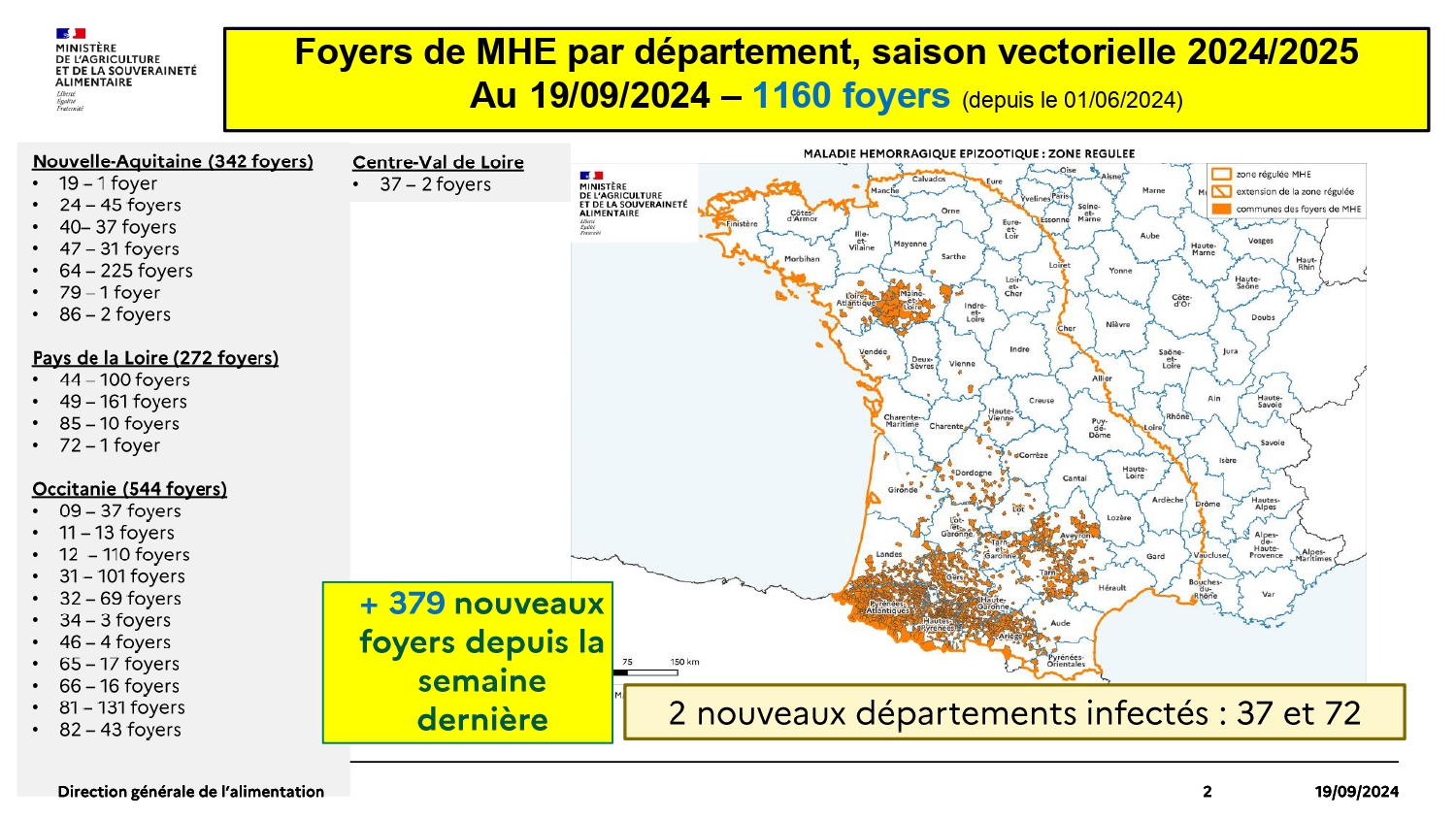 - 41 foyers de MHE (Maladie Hémorragique Épizootique), affectant uniquement les bovins.