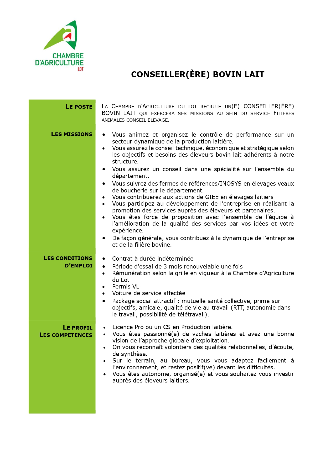 La Chambre d’agriculture du Lot recrute un(e) Conseiller(ère) Bovin Lait !
