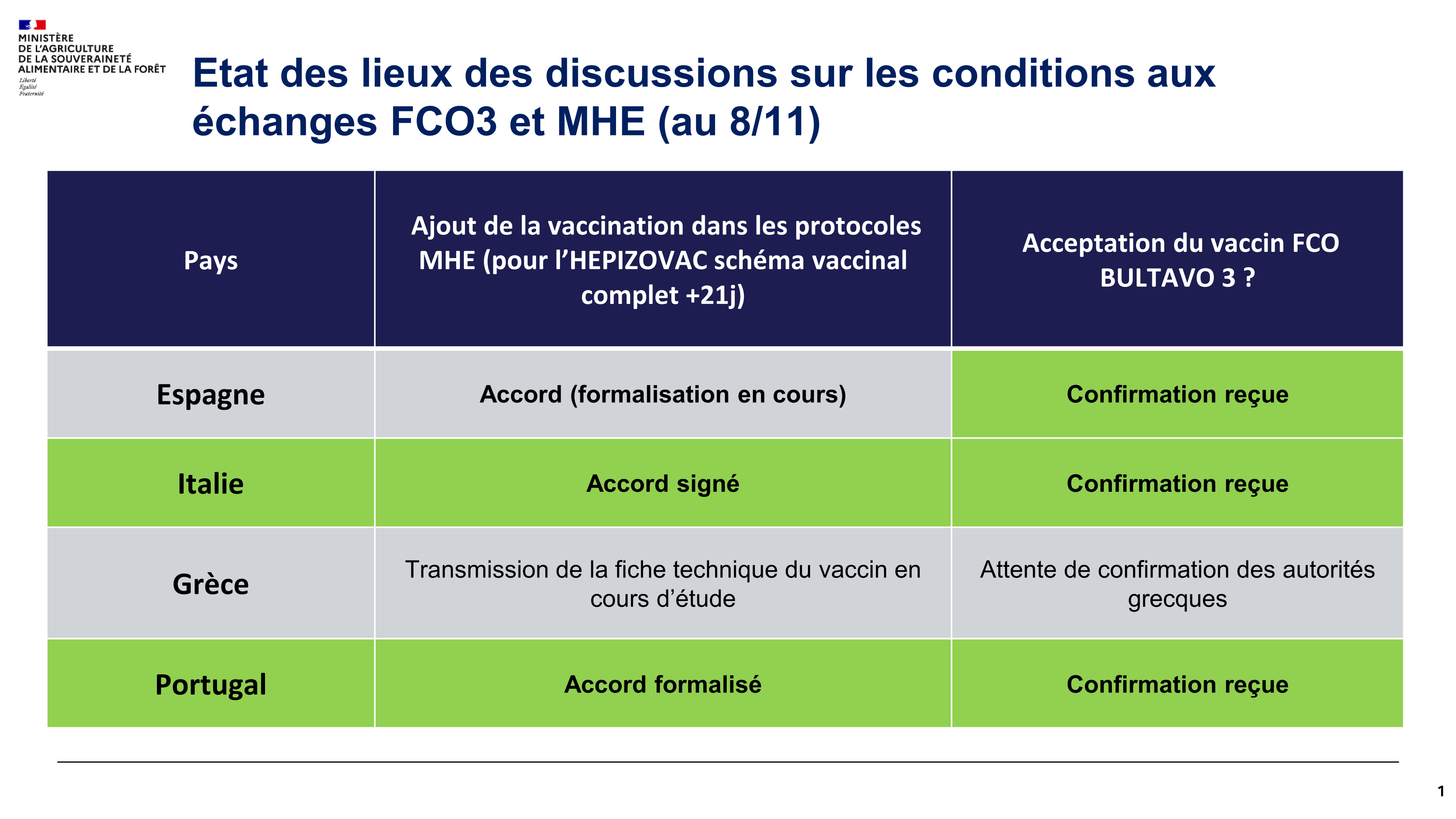 Lors de la dernière réunion de la CPVADAA le 24 octobre, plusieurs États membres, soutenus par la France, ont demandé la reconnaissance des vaccins HEPIZOVAC et BULTAVO 3 pour faciliter les échanges intracommunautaires. Cette demande, appuyée par la Commission européenne, n’a rencontré aucune opposition.