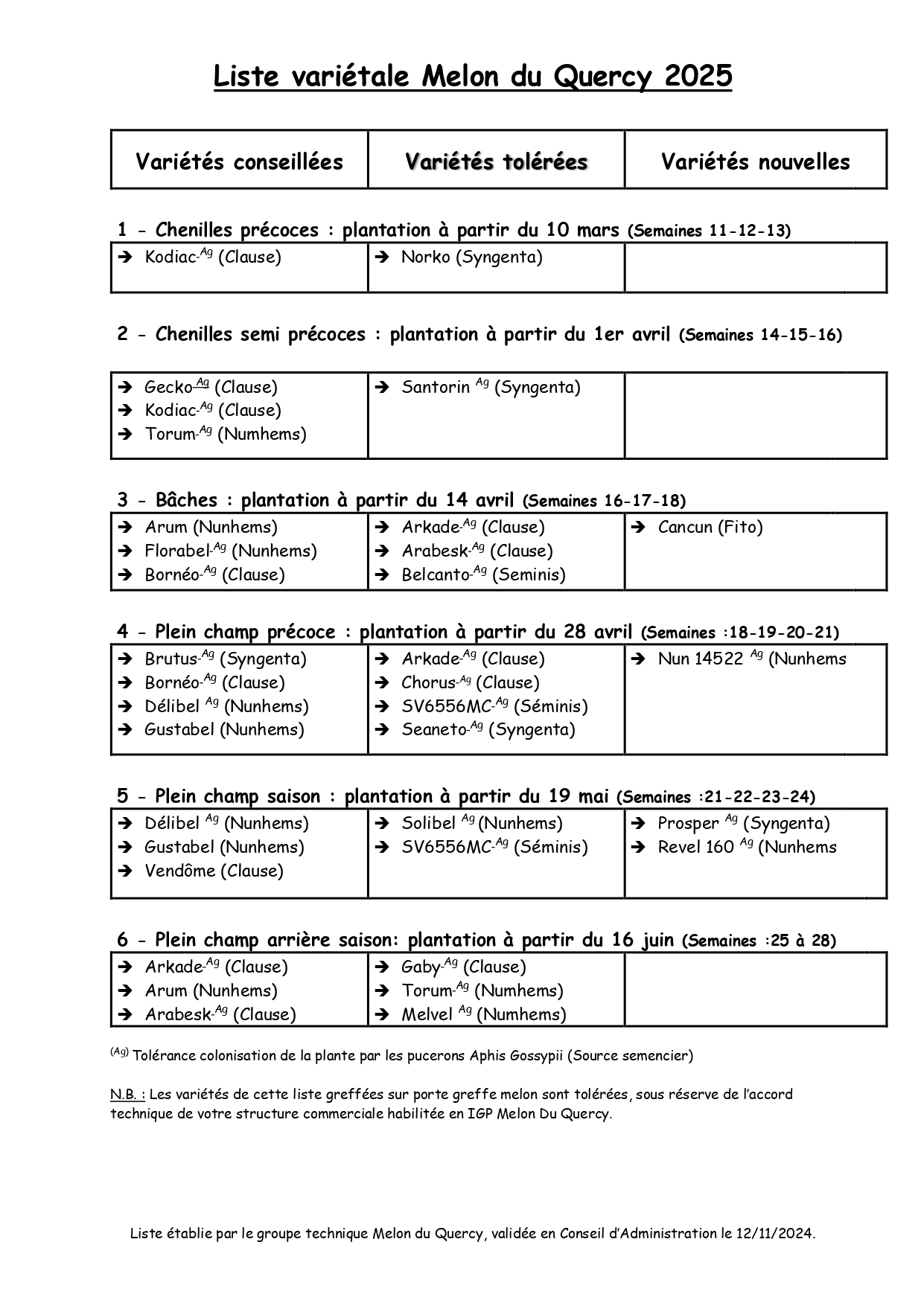 Le syndicat des producteurs de melons du Quercy conseille les variétés suivantes en fonction des résultats qualitatifs et sanitaires observés sur le terrain. Liste établie par le groupe technique Melon du Quercy, validée en Conseil d’Administration le 12/11/2024.