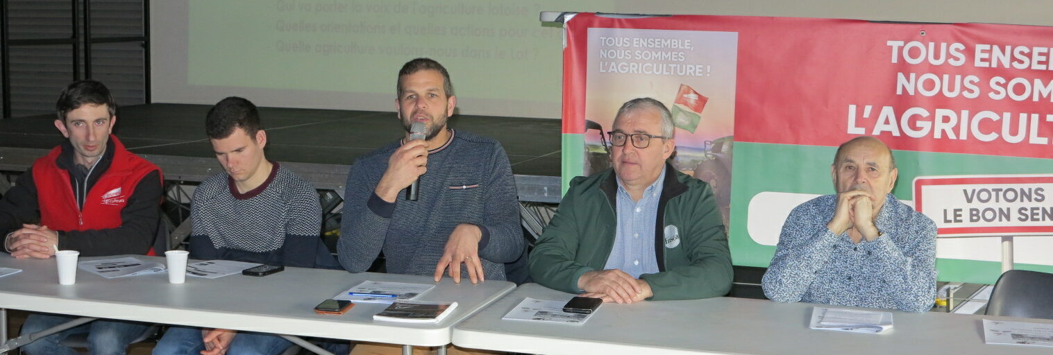 Salle comble le 23 janvier à Gramat pour le dernier meeting de campagne des candidats Fdsea/Ja au renouvellement des membres de la Chambre d’agriculture. Les têtes de liste Stéphane Pons et Quentin Rayjal ont appelé les agriculteurs à voter en masse pour assurer la représentativité de la profession et permettre l’élection de responsables qui connaissent les dossiers et travaillent au quotidien à défendre les exploitants Lotois. Après avoir tenu des réunions sur tous les secteurs du département, les candidats de la liste avaient invité à ce meeting Patrick Benezit, vice président de la Fnsea et président de la Fédération Nationale Bovine, ainsi que JuLien Rouger, vice président des JA. Tous deux sont revenus sur les acquis arrachés de haute lutte par les manifestations de l’hiver dernier et la poursuite du travail syndical pour finaliser leur concrétisation.