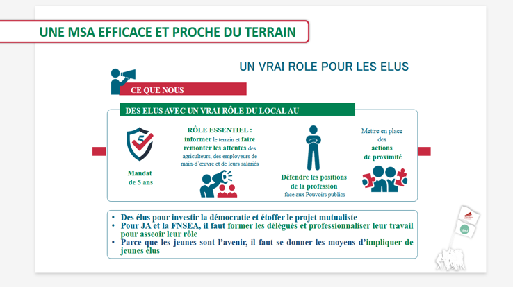Une MSA efficace et proche du terrain parce qu’elle fait mieux que le régime général en défendant un régime social propre à l’agriculture par le guichet unique. (offre globale : maladie, famille, accidents du travail, retraite, prévention…)