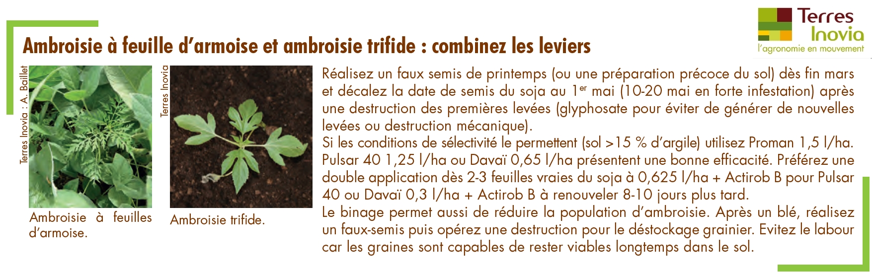 Le contrôle de l’ambroisie en culture de soja représente une réelle difficulté en raison du faible nombre de substances actives à la fois efficaces et sélectives du soja. Dans les situations à forte infestation d’ambroisie (plus de 200 pieds/m2) la culture du soja est déconseillée !
