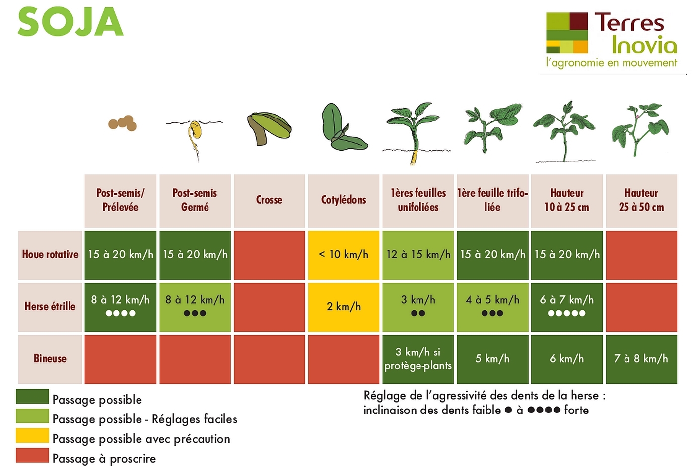 La pression ambroisie peut être diminuée par un désherbage mécanique en cours de culture à la herse étrille et bineuse. La herse étrille peut se passer une première fois dans les 3 jours après le semis et ensuite à partir des premières feuilles unifoliolées (3 km/h maxi avec précautions) jusqu’à 25 cm de hauteur du soja. La herse étrille est efficace par temps sec sur les très jeunes plantules d’ambroisie. L’objectif est de détruire les jeunes levées d’ambroisie avant même qu’elles ne soient visibles. Passer la herse étrille lors de journées ensoleillées, l’après midi, lorsque le soja est moins gorgé d’eau et plus souple. Le binage peut prendre la suite dès 25 cm de hauteur du soja.