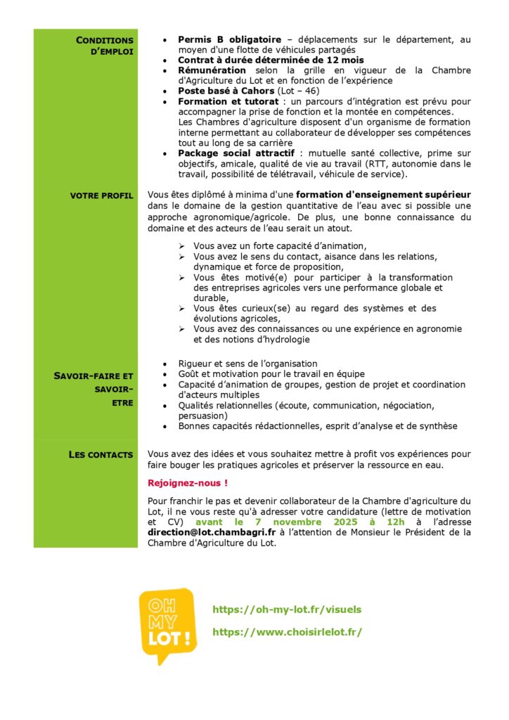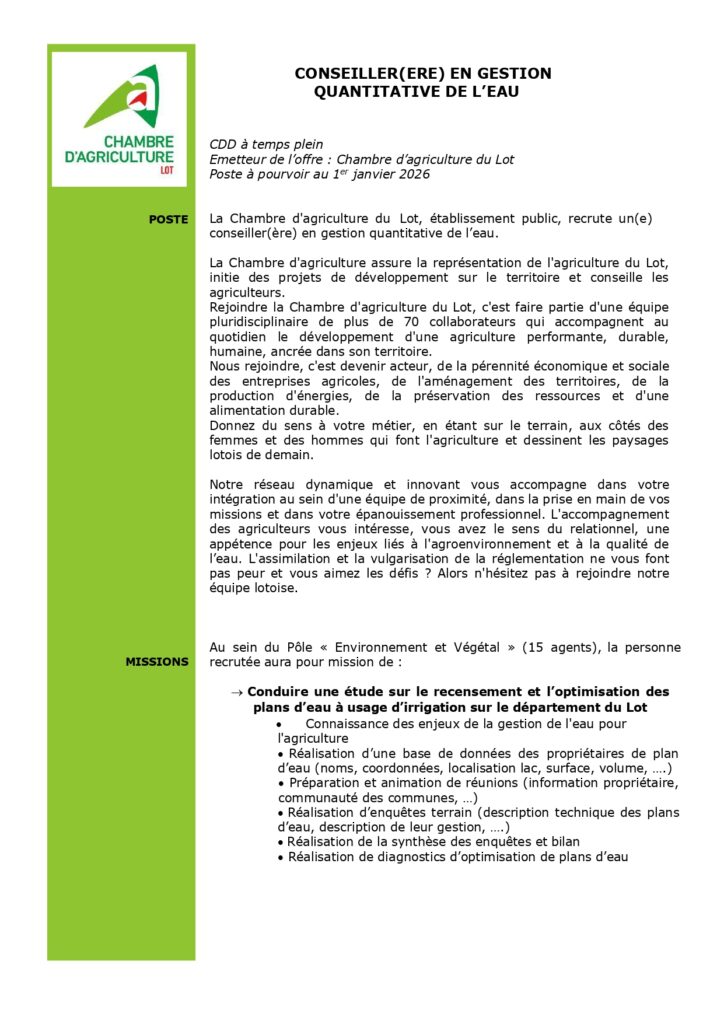 Actualité octobre 23, 2025 Aucun Commentaire 1010 Offre d’emploi : conseiller(ère) en gestion quantitative de l’eau ✍️ TEST SIGNATURE